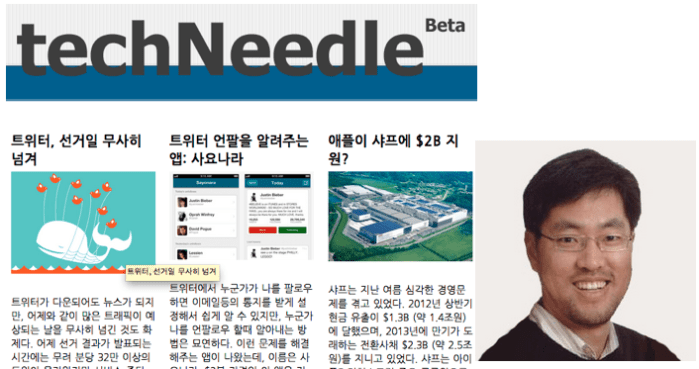 테크니들(트위터 @techneedle)은 실리콘밸리의 월든인터내셔널이란 벤처캐피털회사에서 근무하는 윤필구이사(@philkooyoon)가 시작한 사이트다. 올해 5월에 시작됐다. 그는 한국의 벤처창업자들을 많이 만나다보니 의외로 실리콘밸리나 미국의 테크업계가 어떻게 돌아가는지 잘 모르는 사람들이 많다는 것을 깨달았다. 언어나 시차 때문에 그랬던 것이다. 남보다 빠른 정보가 실리콘밸리에서는 큰 힘이라는 것을 알고 있던 윤이사는 그래서 미국 테크업계의 중요뉴스를 요약해서 한글로 전달하면 필요한 사람들에게 큰 가치가 있을 것으로 생각했다.