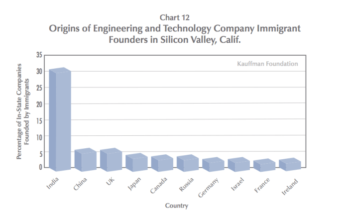 하지만 특기할 만한 것은 그들의 왕성한 창업정신이다. 지난달 발표된 카우프먼재단의 조사결과를 보니 지난 6년간 미국에서 이민자가 창업한 테크기업 중 32%가 인도계에 의한 것으로 나왔다. 이는 2위 그룹인 중국계(8.1%)부터 8위 그룹인 한국계(2.2%)까지 7개 이민자그룹의 창업 숫자를 합한 것보다도 많은 것이다. (이 인용과 위 그래프는 조금 다름. 위 그래프는 실리콘밸리에서의 창업만을 통계로 잡은 것인듯.) – 출처 Then and Now: America’s New Immigrant Entrepreneurs, Part VII
