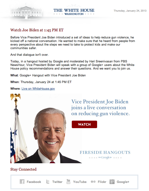 조 바이든 미국 부통령이 총기폭력을 줄이기 위한 그의 노력에 대해 이야기하는 대화시간을 구글+에서 가질 것이란 공지 메일이다. 이것을 보고 다시금 미국의 민주당진영은 정말 소셜미디어활용에 능한 커뮤니케이션의 달인들이라는 느낌을 받았다. 행사 제목도 재미있다. ‘Fireside Hangouts’이다. 루즈벨트대통령의 대국민 라디오담화인 Fireside chats(노변담화)를 본 뜬 것이다.
