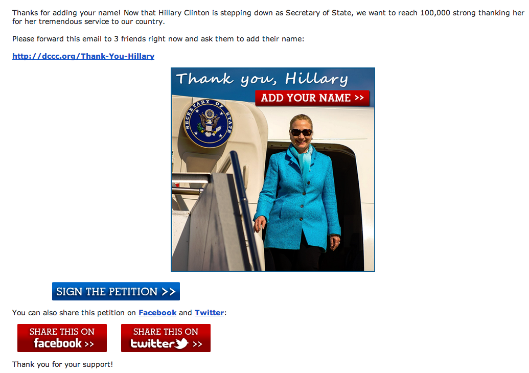 그리고 마침 오늘 또 국무장관직을 마감하는 힐러리 클린턴에게 땡큐메시지를 보내자는 이메일도 받았다.