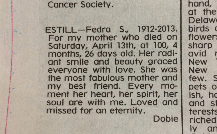 페드라 에스틸. 100년 4개월 26일만에 세상을 떠난 나의 어머니. 그녀의 따뜻한 미소와 아름다움은 모든 사람을 사랑으로 감쌌다. 그녀는 가장 멋진 엄마였으며 나의 가장 친한 친구였다. 그녀의 가슴, 영혼은 항상 나와 함께 했다. 그녀를 영원히 사랑하고 그리워할 것이다. 도비.