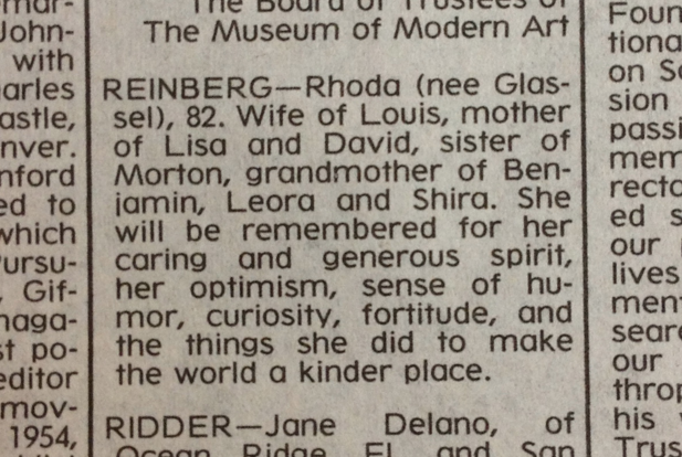로다 레인버그. 82. 루이스의 부인. 리사와 데이빗의 엄마. 벤자민, 리오라, 시라의 할머니. 그녀는 따스함과 온화한 영혼, 낙천주의, 유머, 호기심, 용기, 세상을 따뜻한 곳으로 만들기 위한 노력으로 기억될 것이다.