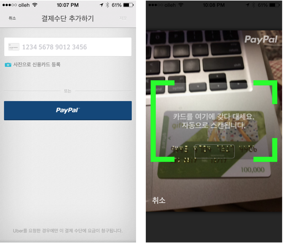 그리고 보니 샌프란시스코에서 택시대신 Uber와 Lyft를 많이 이용했는데 그 이유중 하나가 신용카드정보를 쉽게 저장할 수가 있어서였다. 카드정보 하나 입력하는데 몇십초면 되고 차를 이용한다음에 원터치로 지불하면 된다. 너무 사용하기가 쉬워서 Uber를 자주 이용하게 되어 버렸다. 대중교통수단을 이용해서 돈을 절약해야 하는데 말이다. 한국에서 이런 서비스가 발을 붙이지 못하도록 규제하는 것이 좋겠다.