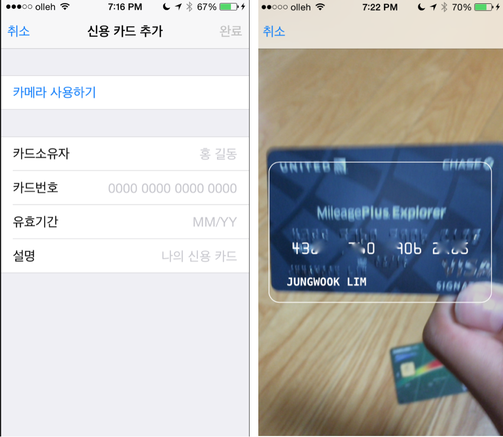 그리고 보니 이번 iOS 8의 사파리브라우저에는 신용카드정보를 저장해둘 수 있는 기능이 들어가 있다. 사파리옵션으로 들어가서 신용카드정보를 저장할 수 있는데 이것 역시 카메라를 사용해서 쉽게 카드정보를 저장할 수 있게 되어 있다. 카드를 가져다대면 순식간에 카드번호, 이름, 유효기간을 저장해준다. 이후 온라인쇼핑몰 등에서 카드정보를 입력하는 페이지가 나오면 자동으로 이 정보를 불러서 입력할 수 있다. 과소비를 조장하는 기능이다. 보안사고라도 나면 어쩔 것인가. 애플이 한국에서는 이렇게 못하도록 규제해야 한다.