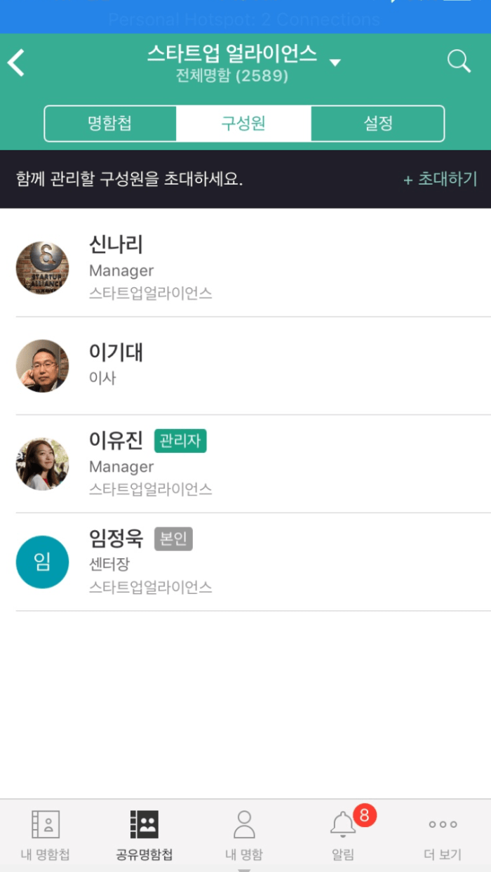 팀과 함께 명함첩을 공유할 수도 있다.