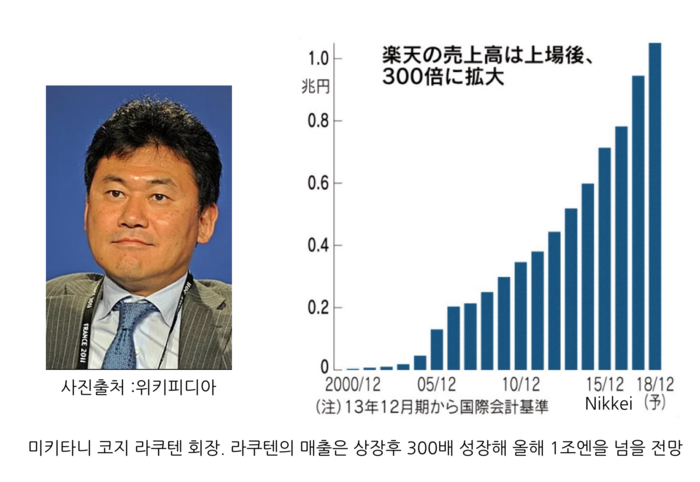 우선 라쿠텐에 대해서 간단히 설명. 97년 일본에서 미키타니 코지 회장이 창업한 라쿠텐은 일본의 전자상거래 기업이다. 인터넷 1세대 벤처라고 보면 된다. 라쿠텐이치바(시장)이라는 온라인쇼핑몰을 통해 성장했으며 이제는 금융, 마케팅에 이동통신사업까지 진출하는 인터넷 그룹이라고 보면 된다. 2018년 매출이 처음으로 1조엔(10조원)을 넘을 것으로 예상되며 프로야구구단도 소유하고 있는 일본을 대표하는 인터넷 기업중 하나다. 시가총액은 약 12조원대다.