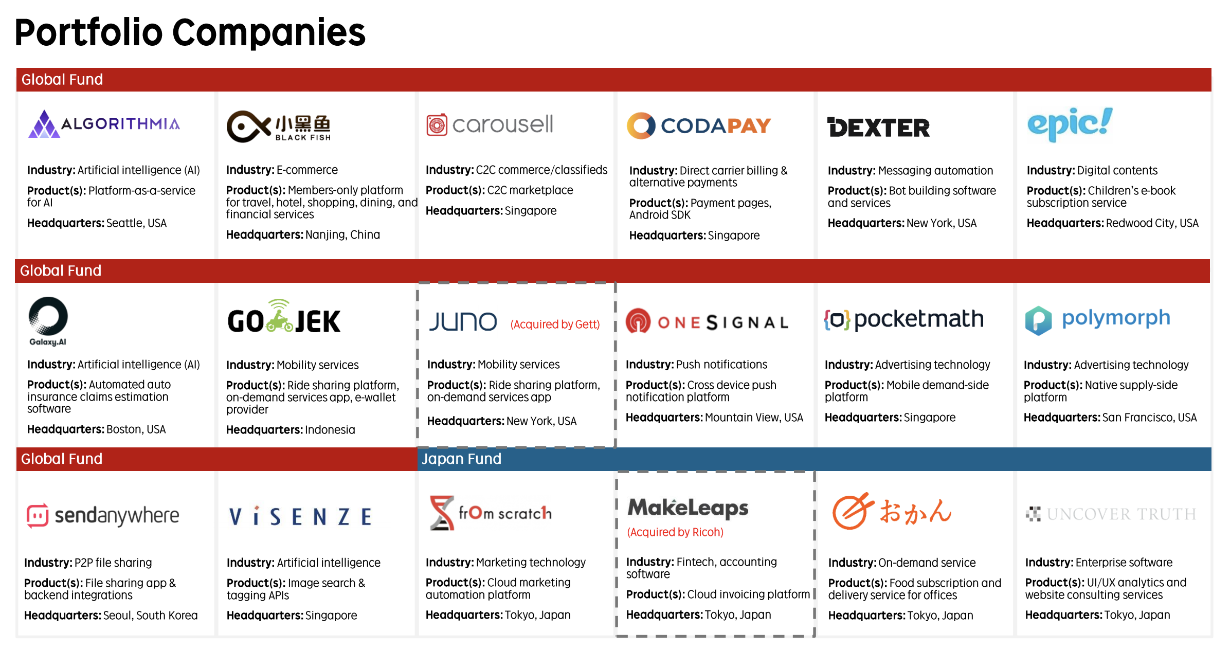 미국, 싱가포르, 일본, 한국, 인도네시아 그리고 최근에는 중국 스타트업까지 투자영역을 넓히고 있다. 투자회사중에 인도네시아의 고젝이 유니콘회사다. 라쿠텐은 이밖에 호창성, 문지원대표가 실리콘밸리에서 창업한 비키를 2013년에 2억불에 인수했으며, 이스라엘의 모바일메신저 바이버를 2014년에 9억불에 인수한 바 있다. 그리고 우버의 경쟁사인 리프트에 투자해 지분 약 10%를 보유한 최대주주다. 핀터레스트에도 상당한 지분을 소유하고 있다. 소프트뱅크만큼은 안되지만 스타트업투자로도 상당한 투자수익을 올릴 전망이다.