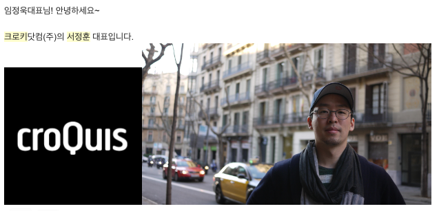 저희 크로키닷컴(주)는 뚜렷한 목표를 지니고 2012.3월초에 창업하여 좋은 사람&비전을 지니고 함께 나아가고 있는 회사입니다.저희 사업 서비스는 스포츠SNS로 영국에서 첫 런칭할 계획으로 준비중에 있습니다. 자세한 사항은 나중에 만나 뵐 기회가 있을 때 설명 드리겠습니다.꼭 좋은 모습으로 임정욱대표님과 처음 대면하는 날을 기대해 봅니다~