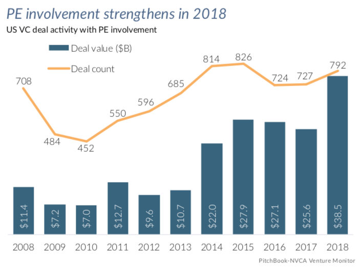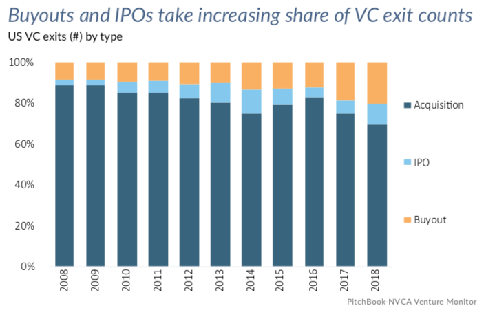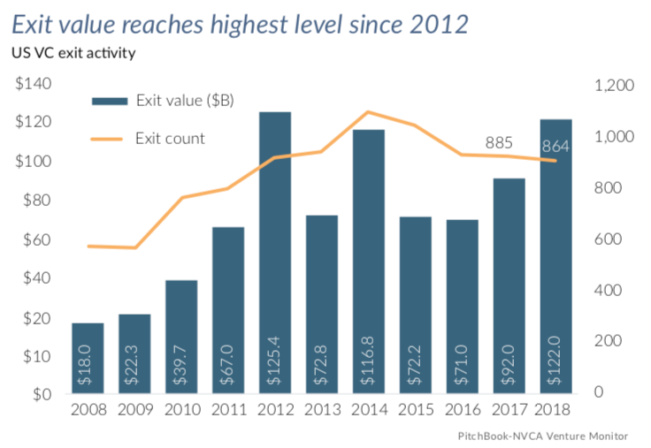 엑싯 마켓에서는 (사모펀드의) 바이아웃과 IPO의 비중이 커졌다. 2018년의 전체 엑싯볼륨은 120B였다. 2018년에는 85회의 IPO가 있어 활발했다. M&A중에서는 7.5B짜리 MS의 GitHub인수가 가장 컸고 그 다음이 시스코의 2.4B짜리 Duo시큐리티 인수였다.