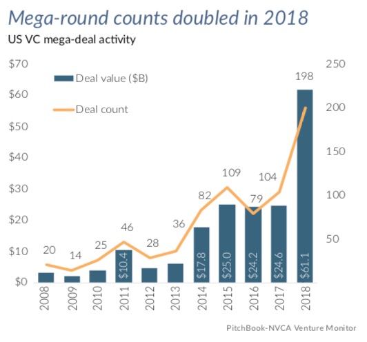 또 100M이상, 즉 1천억원이상 투자되는 메가딜이 2018년에는 이렇게 많이 늘어났다.