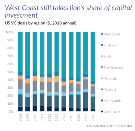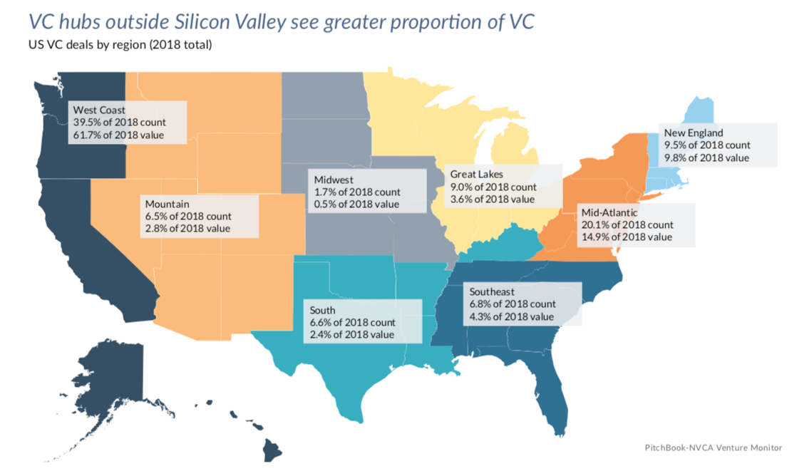 실리콘밸리바깥에도 스타트업이 많이 늘어났다고는 하지만 그래도 미국 전체투자건수의 약 40%, 투자가치로는 약 60%가 서부에 몰려있다.