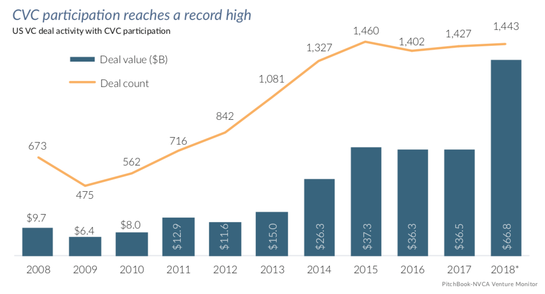 2017년 투자금이 83B이었는데 2018년에는 130.9B로 껑충 뛰어올랐다. 믿기지 않을 정도의 점프다. 사실 100B을 넘을 것으로 예상했지만 엄청나다. 12월20일에 발표된 담배회사 Altria의 Juul Labs에 대한 12.8B 투자가 포함되서 더욱 늘어났다. Juul은 실리콘밸리의 전자담배 스타트업이다.