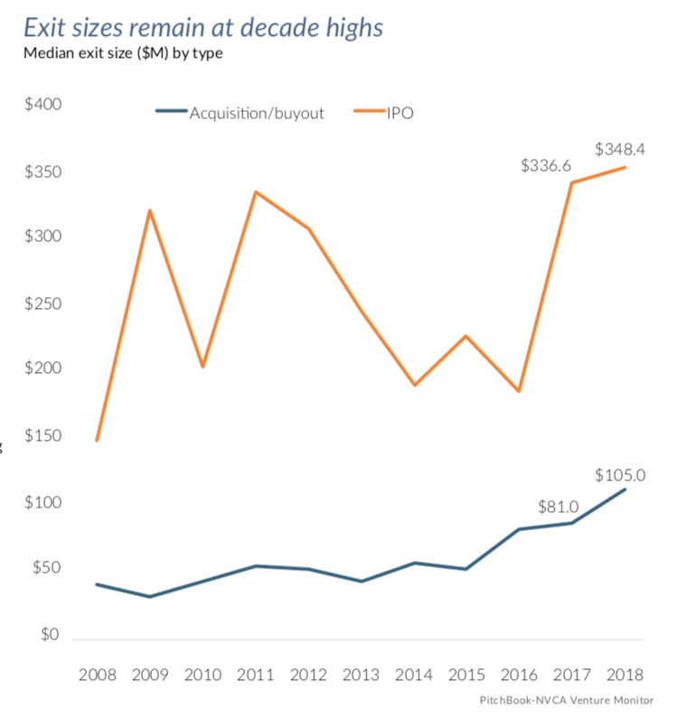 평균 IPO엑싯 사이즈는 348M, M&A사이즈는 105M이다. 상장하면 거의 4천억원에 가까운 엑싯이고, M&A는 보통 1천억원이 좀 넘는 사이즈다. 한국은 어느 정도 나오는지 궁금하다.