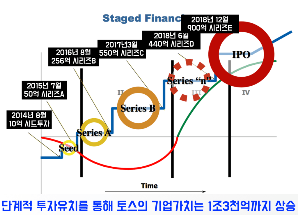 일 년 뒤인 2016년 8월에 256억 원의 시리즈 B 투자를 받습니다. 토스가 이제 본격적으로 성장하면서 좋은 인력을 확보하고 마케팅, 인프라 등에 투자하기 위한 자금이었습니다. 2017년 3월에는 미국의 온라인송금 1위 회사인 페이팔까지 들어와 550억원의 거액 시리즈 C 투자를 받습니다. 그리고 2018년 6월에는 싱가포르투자청(GIC)과 세콰이어 차이나로부터 440여억 원의 투자를 유치했고 마침내 12월에는 실리콘밸리의 클라이너퍼킨스와 리빗캐피탈에게 900억원을 투자받아 1조3천억원기업가치의 유니콘이 됐습니다.
