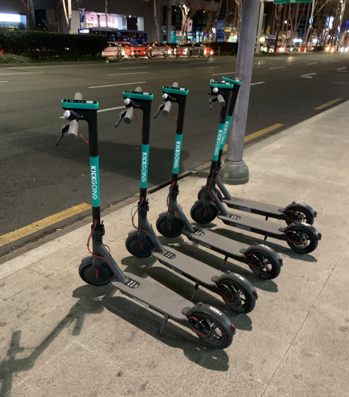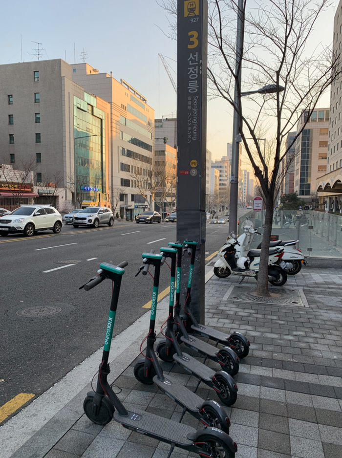 그런데 추운 겨울이 됐는데도 킥고잉 스쿠터를 타는 사람들이 요즘 의외로 자주 보인다. 그리고 서비스 영역이 늘어난 것 같다. 우리 스얼 사무실 건너편에 이렇게 스쿠터가 가지런히 놓인 것을 봤다.