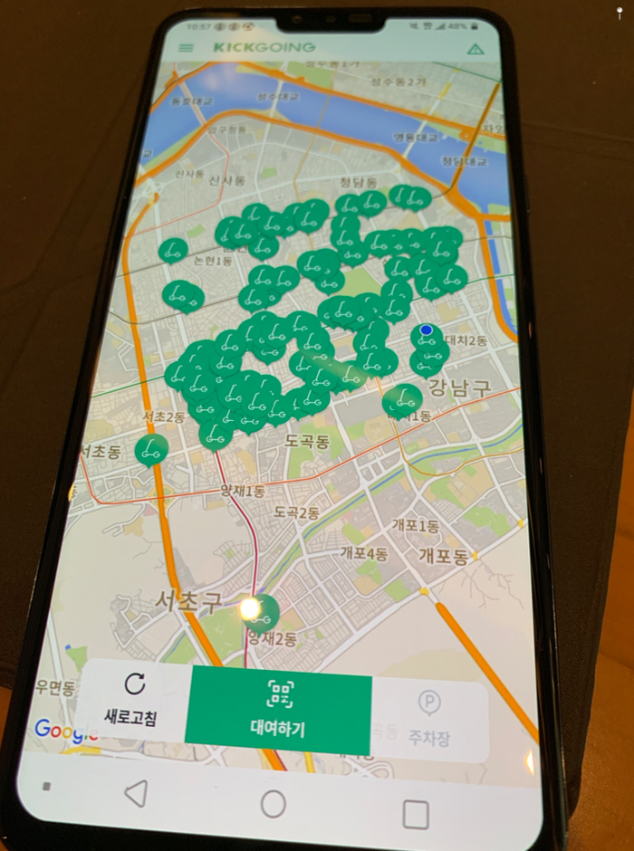 또 하나는 전동 공유스쿠터 킥고잉이다. 해외에서 폭발적으로 인기를 얻고 있는 버드와 라임의 공유스쿠터와 비슷한 서비스다. 이것도 지난해 9월28일에 역삼역에서 처음 발견했다. 신기해서 사진을 찍어두고 이후 7번정도 이용해봤다. 역시 과연 한국에서 될까 싶었다. 서비스 영역도 강남역에서 선릉역사이 구간이라 내 동선과는 잘 일치하지 않아서 쓰기 어려웠다.