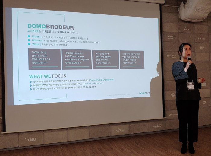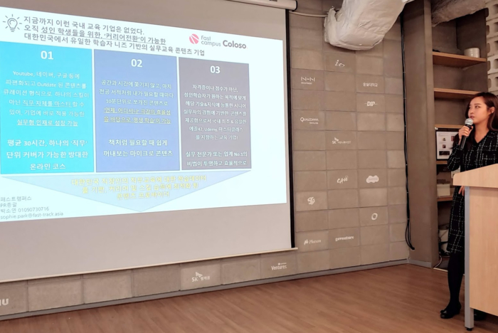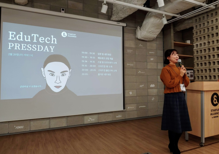 스얼은 홍보대행사인 도모브로더와 제휴해서 분기별로 프레스데이를 갖는다. 특정분야의 스타트업 홍보담당자들과 다양한 매체의 기자들이 만나서 자유롭게 교류할 수 있도록 하는 모임이다. 유망한 스타트업이 보다 많은 언론에 소개됐으면 하는 마음에서 마련한 행사인데 아주 보람있게 진행하고 있다. 2월20일 저녁에는 에듀테크를 주제로 스타트업을 소개했다. 행사 PM을 맡고 있는 정다연 매니저가 첫 인사말을 하고 있다.