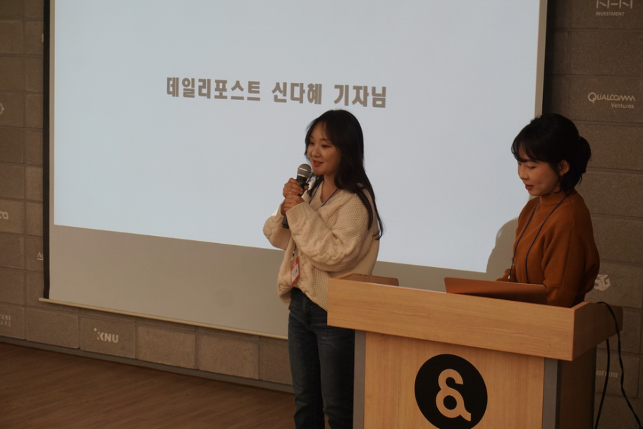 이렇게 21개 스타트업의 1분 소개가 끝나고 기자들도 가볍게 인사를 한다. 기자들도 10여명이다.