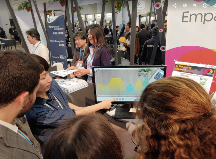 일본스타트업도 있다. 인공지능을 이용해 음성을 감정분석해주는 스타트업이 고객에게 제품을 설명하고 있다.