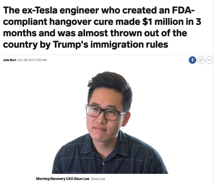 “2017년 사업을 처음 시작할 때 ‘전 테슬라 엔지니어가 만든 숙취음료’로 소개된 비즈니스인사이더 기사가 페북 등에서 엄청나게 공유되면서 회사를 알리고 매출을 늘리는데 큰 도움을 얻었다. 이것이 맨 처음으로 한 언론 인터뷰였는데 이후에도 다른 매체에 많이 나왔지만 이 정도 효과가 난 인터뷰가 없었다. 사실 잘 쓴 기사라기보다 가볍게 인터뷰하고 좀 거칠게 쓴 내용이었는데도 그렇다는 것이 역설적이다.”