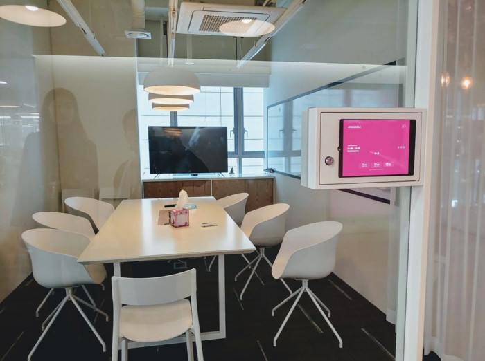 회의실. 아이패드로 예약할 수 있도록 해두었는데 이 예약시스템도 직접 만들었다고 한다.