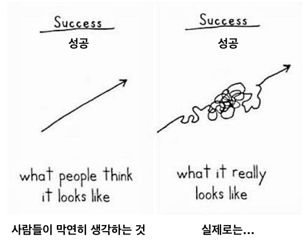 그런데 사실 현실은 오른쪽 그림과 같다. 알고 보면 오만가지 고난, 시행착오를 통해 성공에 이른 것이다. 결코 아름답지 않은 일도 많다. (우리는 불완전한 인간이니까.) 창업팀간의 반목, 다툼, 시기 그리고 집단 퇴사 등등. 돈이 다 떨어져서 망하기 직전까지 가는 일 등이 실제로 벌어진다. 그러다가 하늘이 도와 귀인을 만나서 간신히 위기를 넘긴다. 그러다가 시리즈 A, 시리즈 B 등을 지나 어느 정도 대외적으로는 멀쩡한 회사처럼 보이는 단계가 된다. 하지만 급성장을 하는 회사는 당연히 내부는 항상 불안정하고 정신이 없다. 외부에서는 “잘나가는 그 회사는 사실 알고 보면 내부는 개판이라더라”는 말이 루머처럼 떠돈다. 그런 회사에서 잘 적응하지 못하고 떠난 사람들이 그런 이야기를 확대 재생산한다.