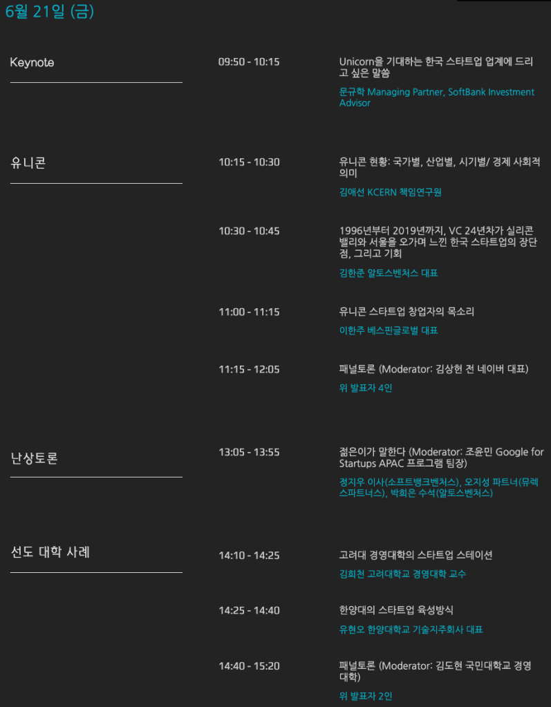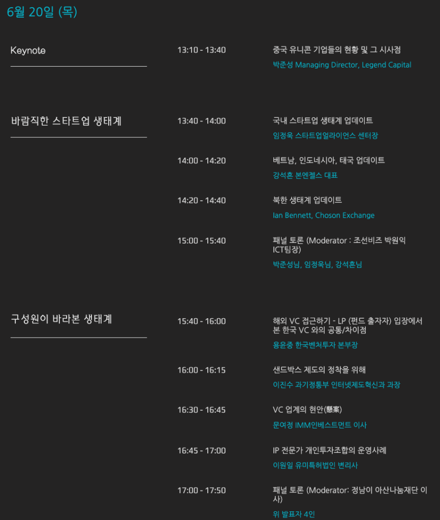 이틀째 프로그램은 위와 같습니다. 다양한 시도를 하고 있는 많은 분들의 이야기를 듣기 위해서 고민해서 짠 내용입니다. 100조원짜리 소프트뱅크 비전펀드를 운영하고 있는 문규학파트너님의 말씀이 기대됩니다.