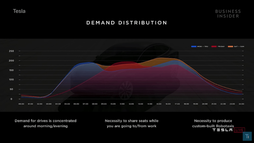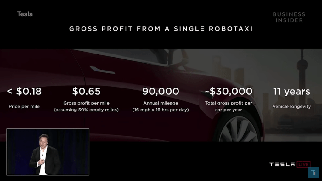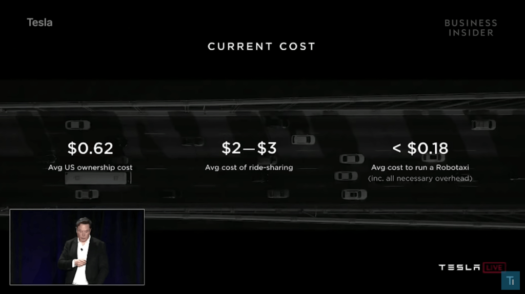 일론 머스크는 우버같은 승차공유 서비스의 마일당 원가가 2~3불이고, 차를 직접 소유하는 경우에는 마일당 62센트의 원가가 드는데 테슬라 로보택시의 원가는 18센트밖에 되지 않는다고 밝혔다.