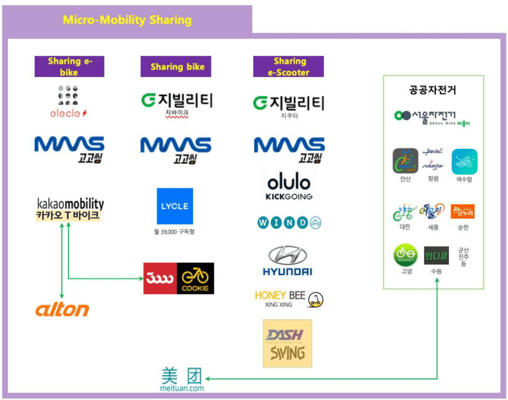 Update : 최근 모빌리티시장의 변화를 다룬 ‘이동의 미래’의 저자 한국과학기술기획평가원(KISTEP) 차두원박사가 만든 한국 마이크로 모빌리티 공유시장의 경쟁 상황 지도를 여기 첨부한다. 전체 한국 모빌리티업계 지도는 이 링크에서 볼 수 있다.