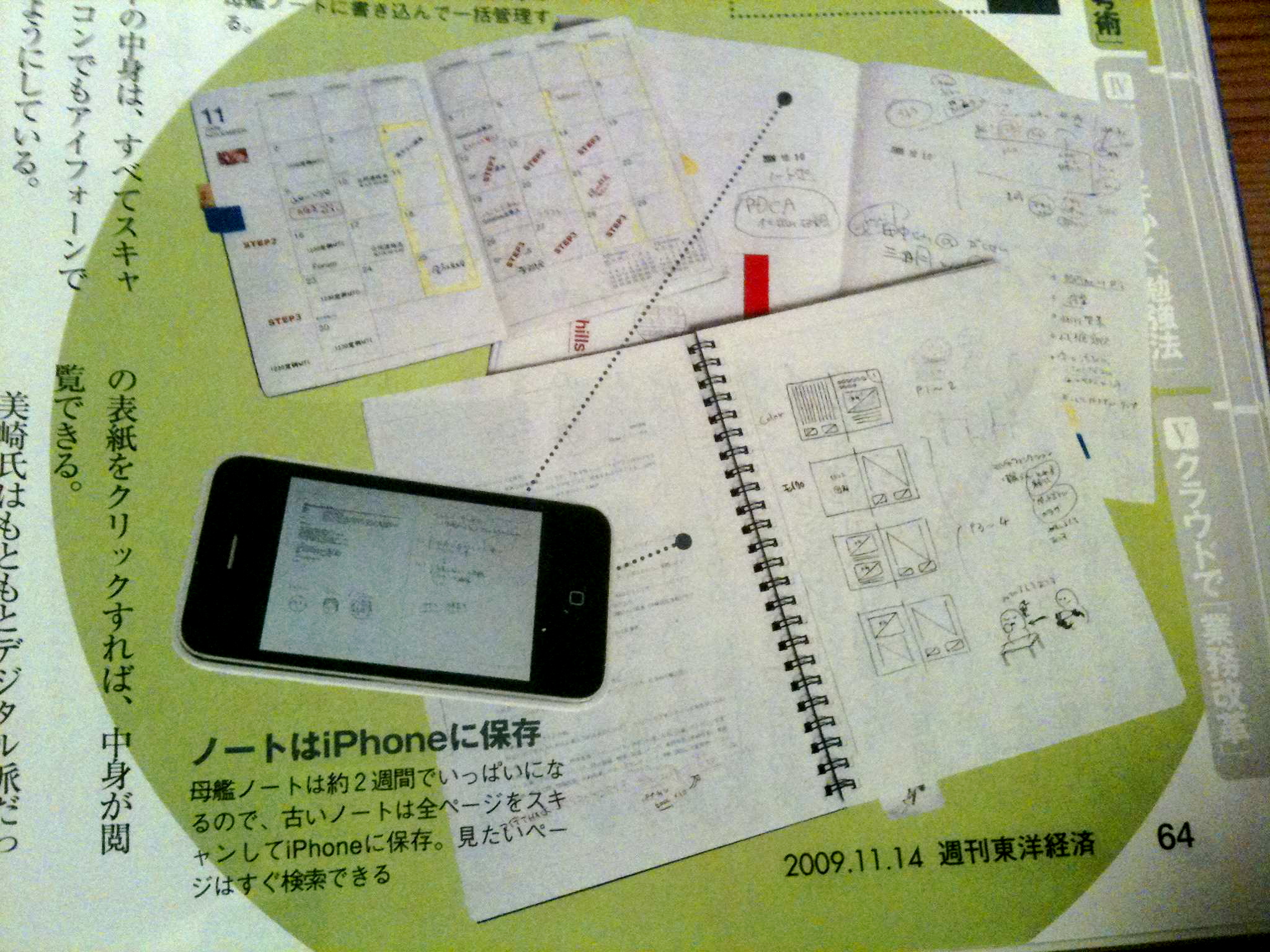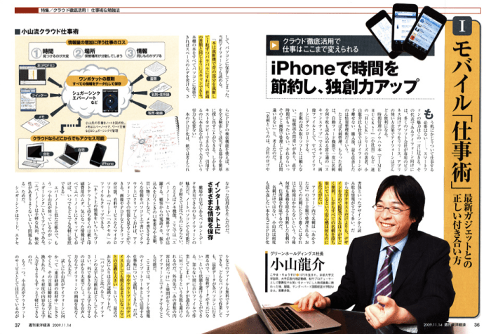 유명 시간관리 컨설턴트인 코야마 류스케씨의 이야기가 첫 기사로 소개. 아이폰과 맥북에어를 사용하고 있는 코야마씨는 명함부터 모든 것을 다 스캔해서 에버노트 등에 올려놓은 다음 아이폰이나 맥북으로 필요할때마다 꺼내서 본다고. 특히 감탄한 것은 서류부터 책까지 종이로 된 것은 하나도 가지고 다니지 않는다는 것. 책은 꼭 2권을 구입해 한권은 보관, 다른 한권은 스캔하기 쉽게 절단해서 모든 페이지를 PDF화, 아이폰과 맥북에 넣어가지고 다니면서 본다고.