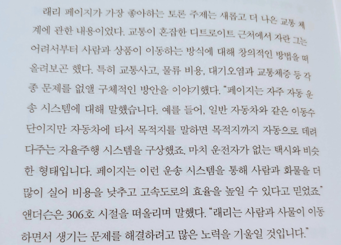왜 구글이 2009년도에 일찍 자율주행차 개발에 나섰고 2013년에 우버에 2억5천8백만달러라는 거액을 투자했는지 궁금했다. 구글은 여기에 그치지 않고 자율주행차 개발부문을 웨이모로 독립시키고 자율주행차 서비스개발에 박차를 가하고 있다. 왜 그런지 궁금했는데 96년 스탠포드대 대학원건물에서 공부하던 래리 페이지는 이미 이렇게 자율주행차시스템에 관심이 많았다고 한다. 이제 수긍이 간다. 앞으로 구글이 정복하고자하는 넥스트 프론티어는 자율주행차를 이용한 모빌리티 서비스일 것이란 생각이 확실히 든다.