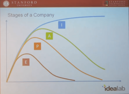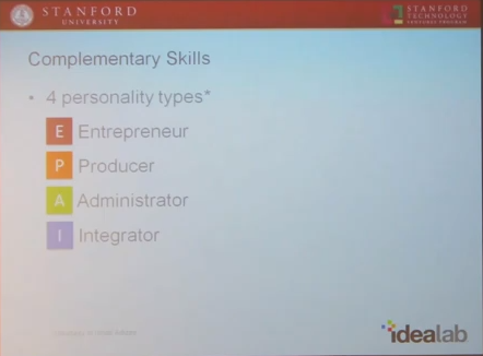 그는 이 스탠포드 강연에서 수많은 기업을 창업하고 조언하면서 그가 얻은 경험과 교훈을 공유한다. 그중 그는 매니지먼트팀 멤버가 갖는 4가지 유형의 성격타입에 대해 말한다. 그에 따르면 사람은 Entrepreneur (E), Producer (P), Administrator (A), Integrator (I) 4가지 유형으로 나눌 수 있다는 것이다. 물론 사람을 이 4가지유형중 하나로 단순히 정의할 수는 없으며 보통은 이 4가지 성격이 혼합되면서 어느 한가지가 가장 두드러지는 경우가 많다.