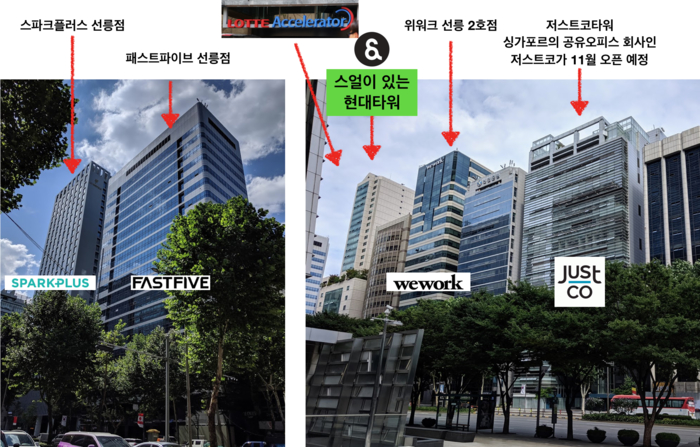 그러다보니 스얼이 있는 선릉역 10번출구부터 포스코사거리 사이에 공유오피스가 늘어나기 시작했다. 패스트파이브 선릉점을 시작으로 공유오피스가 생기기 시작했다. 스얼 옆옆에 야놀자가 있던 빌딩을 위워크가 완전히 접수해서 위워크 빌딩으로 바꿔버렸다. 그리고 패스트파이브 옆에 롯데가 만든 빌딩에 스파크플러스가 들어왔다. (스얼 바로 옆에는 또 롯데액셀러레이터가 있다.)