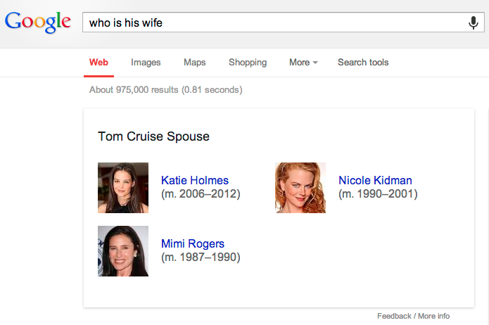 단답식으로 쉽게 대답하기 어려울 때는 아래와 같이 음성없이 검색결과만 나온다. 어쨌든 대명사를 계속 탐 크루즈로 인식하는 것이다.