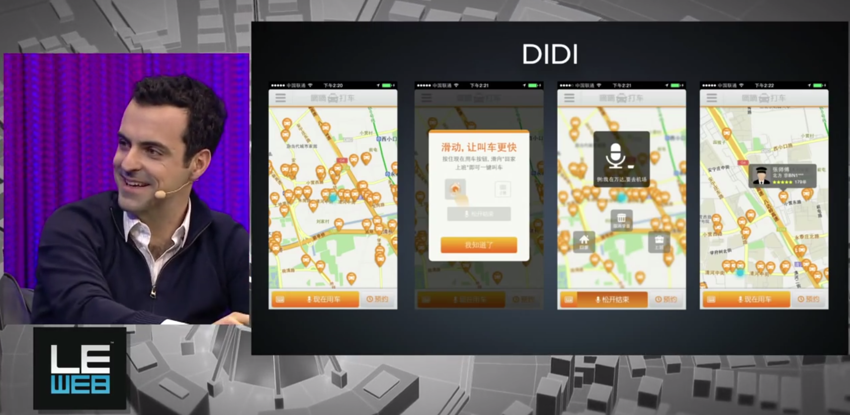 중국판 Uber라는 DIDI. 택시를 부를때 이 앱을 사용하는데 GPS로 위치를 알려주면서도 보이스메모로 택시기사에게 더 자세한 위치설명을 하거나 팁을 더 주겠다고 제안하는 기능이 인기라고. 중국의 택시운전사들은 거의 모두 이 앱을 이미 쓰고 있다는 설명.
