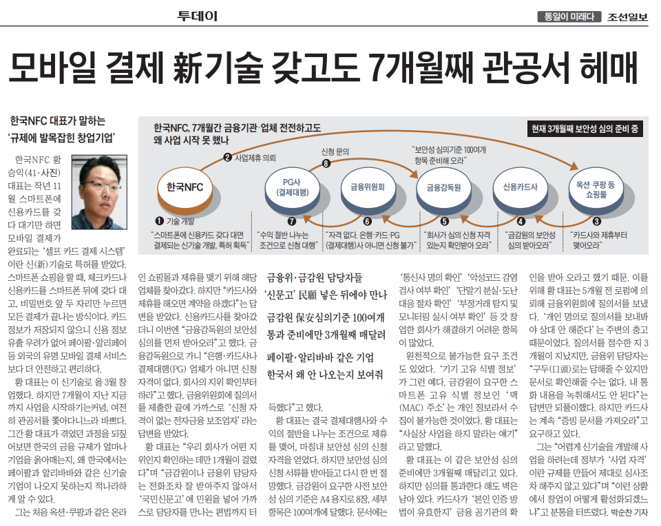 2014년 11월3일 조선일보 2면 톱기사다. NFC기술을 이용한 모바일간편결제솔루션을 개발한 한국NFC 황승익대표의 규제분투기다. 4년반전에도 비슷한 상황이었다.