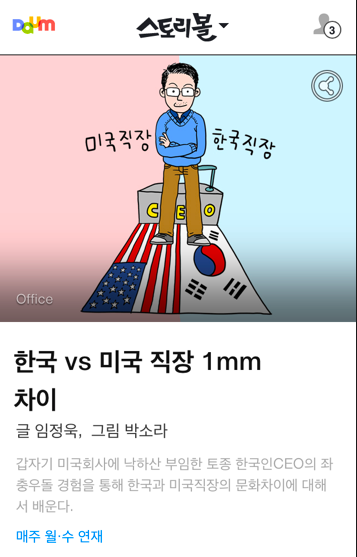 어쩌다가 한달전부터 다음 스토리볼에 “한국 vs 미국 직장 1mm차이“라는 시리즈를 연재하게 됐다. 스토리볼은 다음에서 심혈을 기울여 만드는 일종의 ‘웹툰의 텍스트, 스토리버전’으로 다음이 직접 기획, 작가를 섭외해서 모바일에 맞게 편집해서 연재하는 모바일콘텐츠플렛홈이다. 다음앱이나 모바일브라우저에서 최적화된 상태로 볼 수 있다.