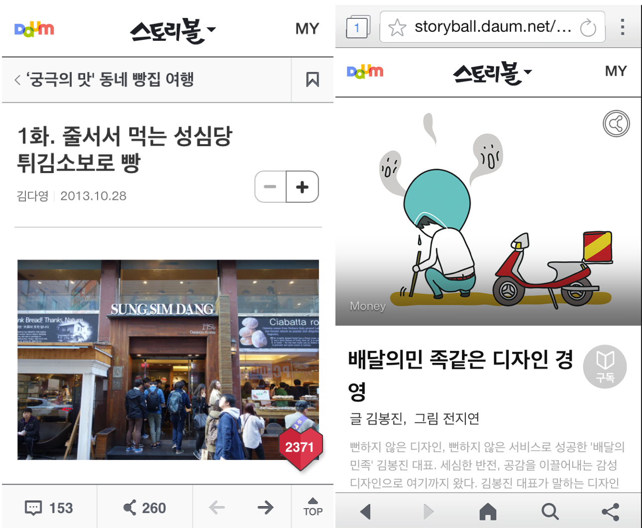 다음 스토리볼팀이 SNS에서 인기가 있는 작가를 열심히 섭외해서 모신뒤 모바일에 맞게 콘텐츠를 편집해서 올린다. 우아한 형제 김봉진대표는 삽화, 사진까지 직접 만들어 제공하는 경우다.