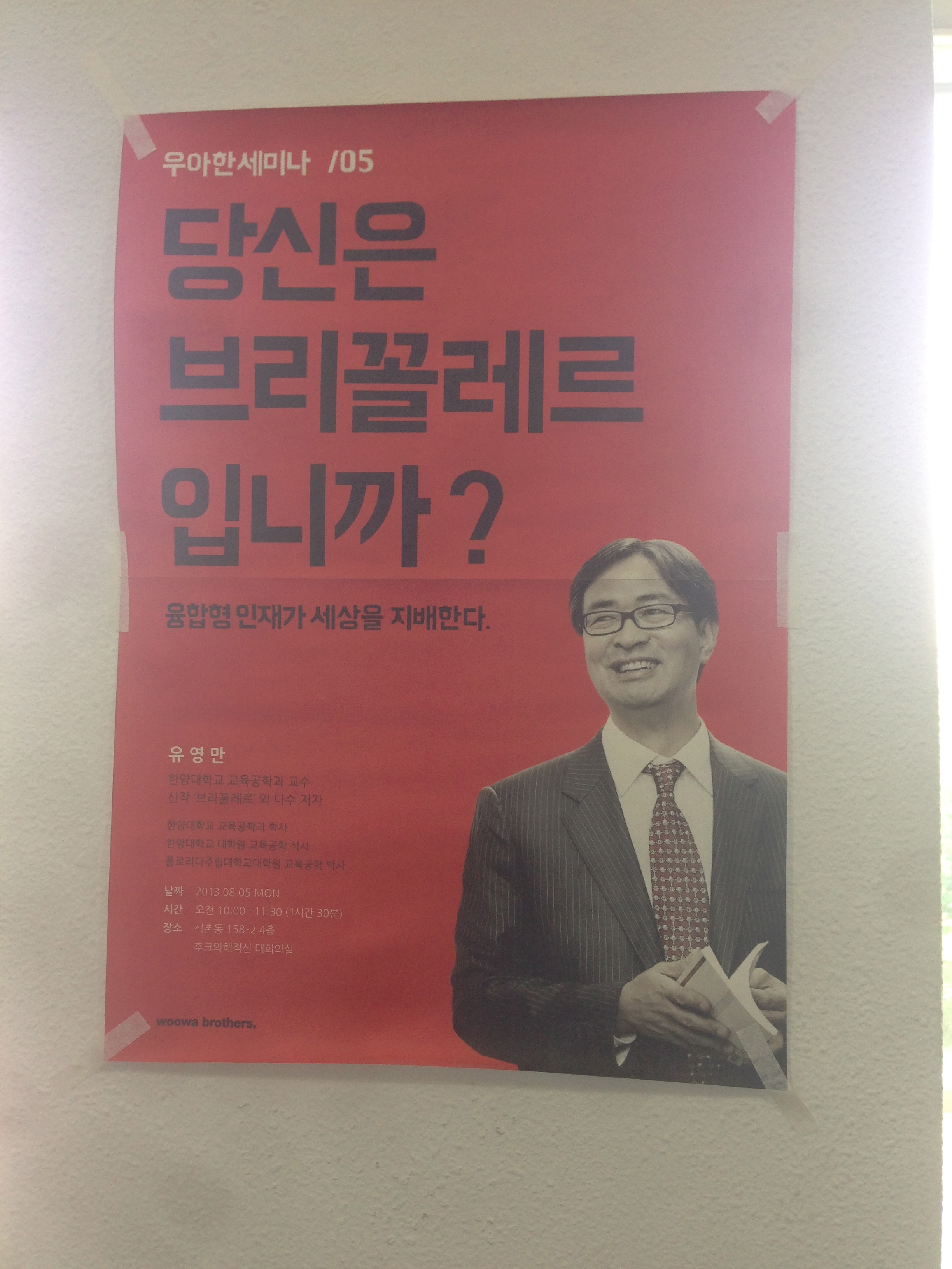 우아한 형제 홈페이지에도 이런 모습을 보여주는 사진이 있다. 이렇게 독특한 디자인과 메시지의 포스터가 회사안에 넘쳐나는 것은 김봉진대표가 디자이너 출신인 점과도 무관하지 않을 것이다. 그리고 사진을 깜빡 찍지 못했는데 회사내에 책이 넘쳐난다. 책값은 조건없이 무한지원이라고 한다. 책을 좋아한다는 것은 ‘배움’을 중요시하는 문화가 있다는 것이다. 작은 회사규모에도 불구하고 매달 (IT와는 상관없는) 인문학 등 다양한 분야의 외부인사를 초청해 강연을 듣는 문화도 인상적이다. 이런 강연내용에 대해서도 포스터가 붙어있다.