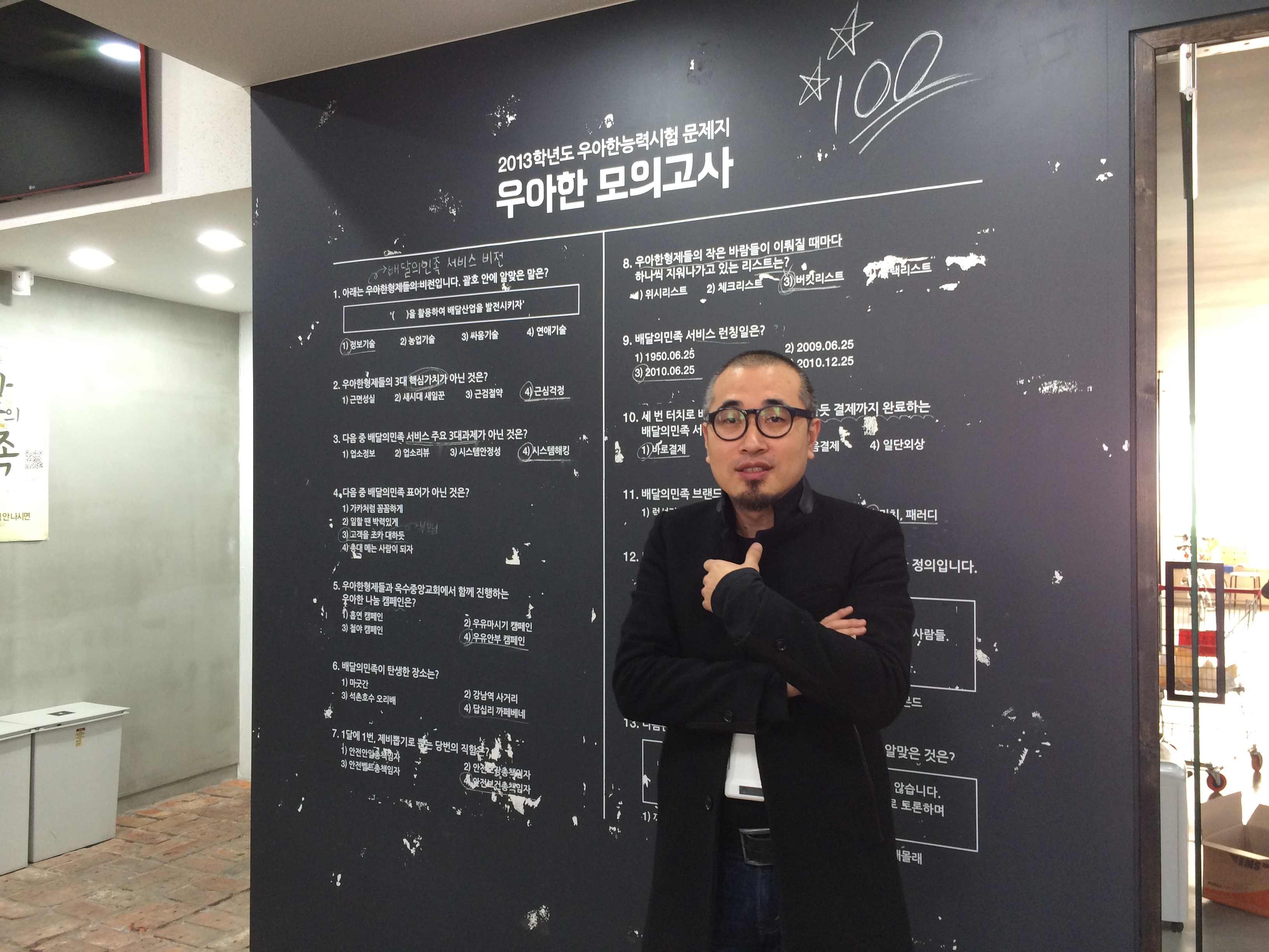 세심하게 사무실 구석구석 투어를 시켜준 김봉진대표. 벽면의 ‘우아한 모의고사’는 회사의 핵심가치를 묻는 질문으로 만들어져 있다.