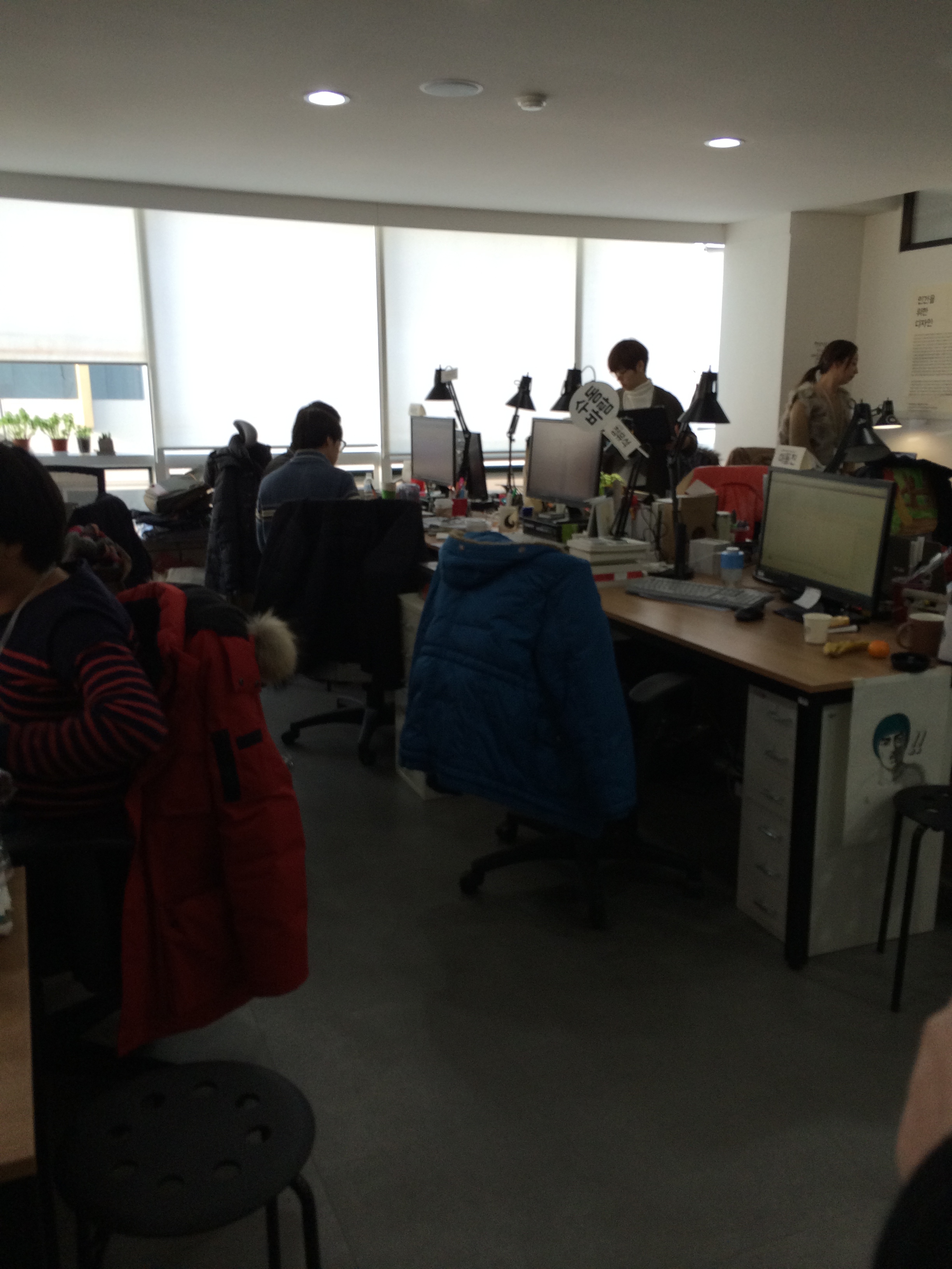 사무실의 모습이다. 큐비클 같은 칸막이가 없고 모두 오픈된 공간에서 같이 일한다. 사무실에 음악을 틀어놓아서 약간은 시끄러운 분위기를 만드는 것이 특징이다. 조용히 있는 것 보다 서로 자유롭게 대화하고 떠들면서 일할 수 있는 분위기를 만들겠다는 것이다. 떠들면서 새로운 창의적인 아이디어가 나올 수 있다고.