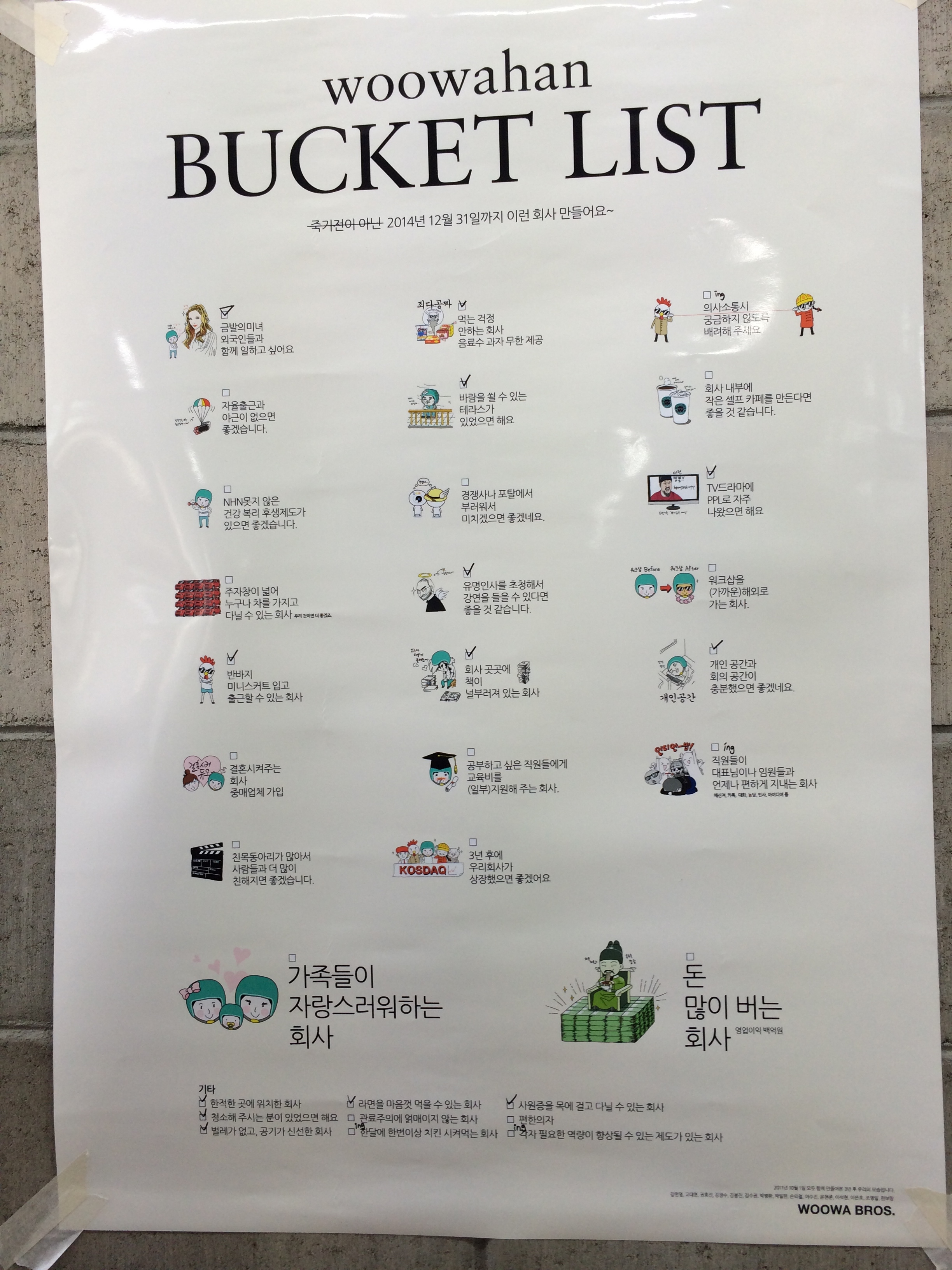 멋진 버킷리스트를 만들고 하나하나 성취해 나가는 회사. 앞으로 우아한 형제가 어떤 회사로 성장해 나갈지 궁금하다.