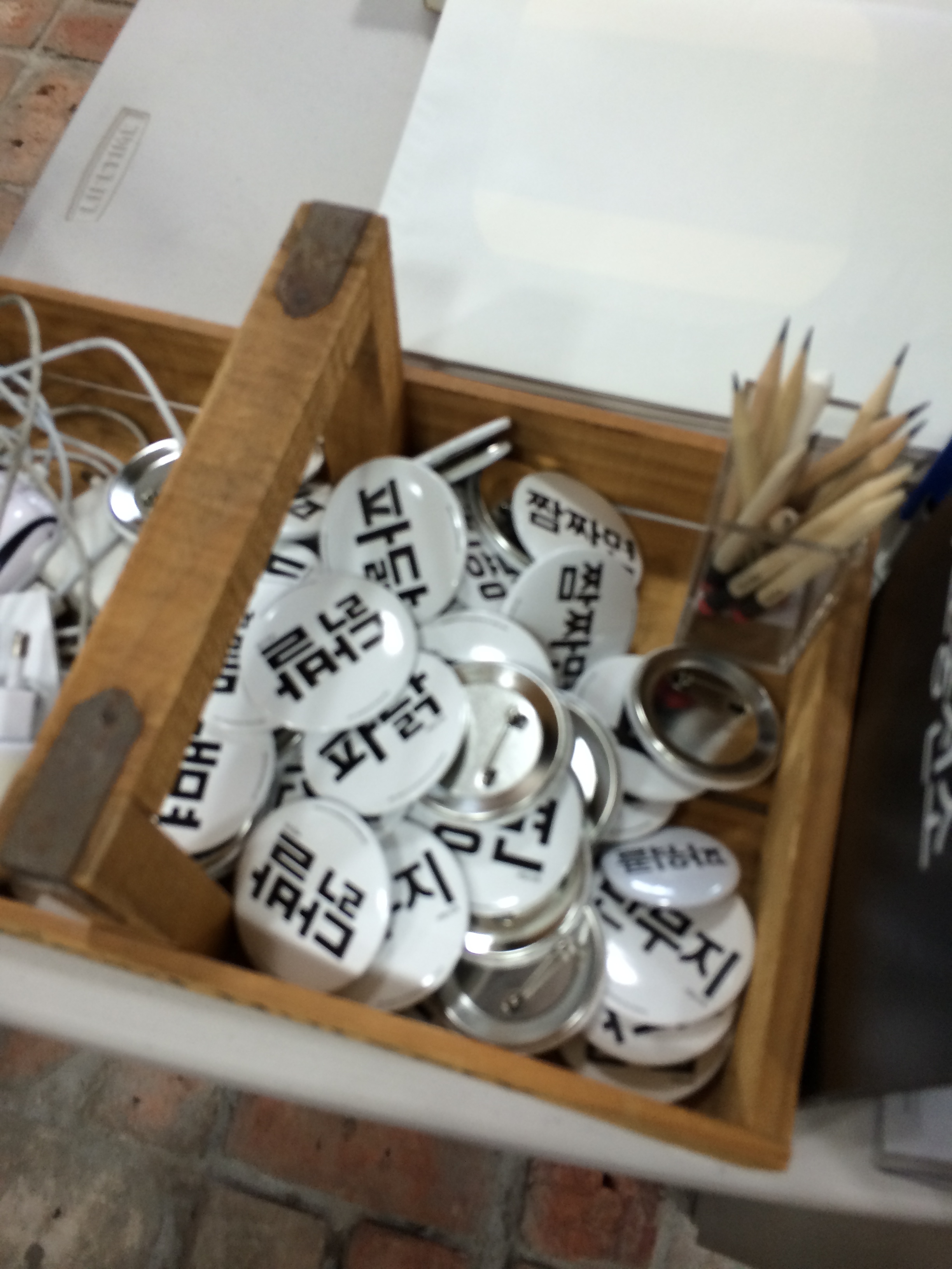 95명의 회사직원들이 인쇄된 뱃지들이 전시되어 있다. 회사에 입사하면 개성있는 모습의 사진을 찍게 되있고 그 사진을 뱃지로 만들고 출입증에 넣는다.