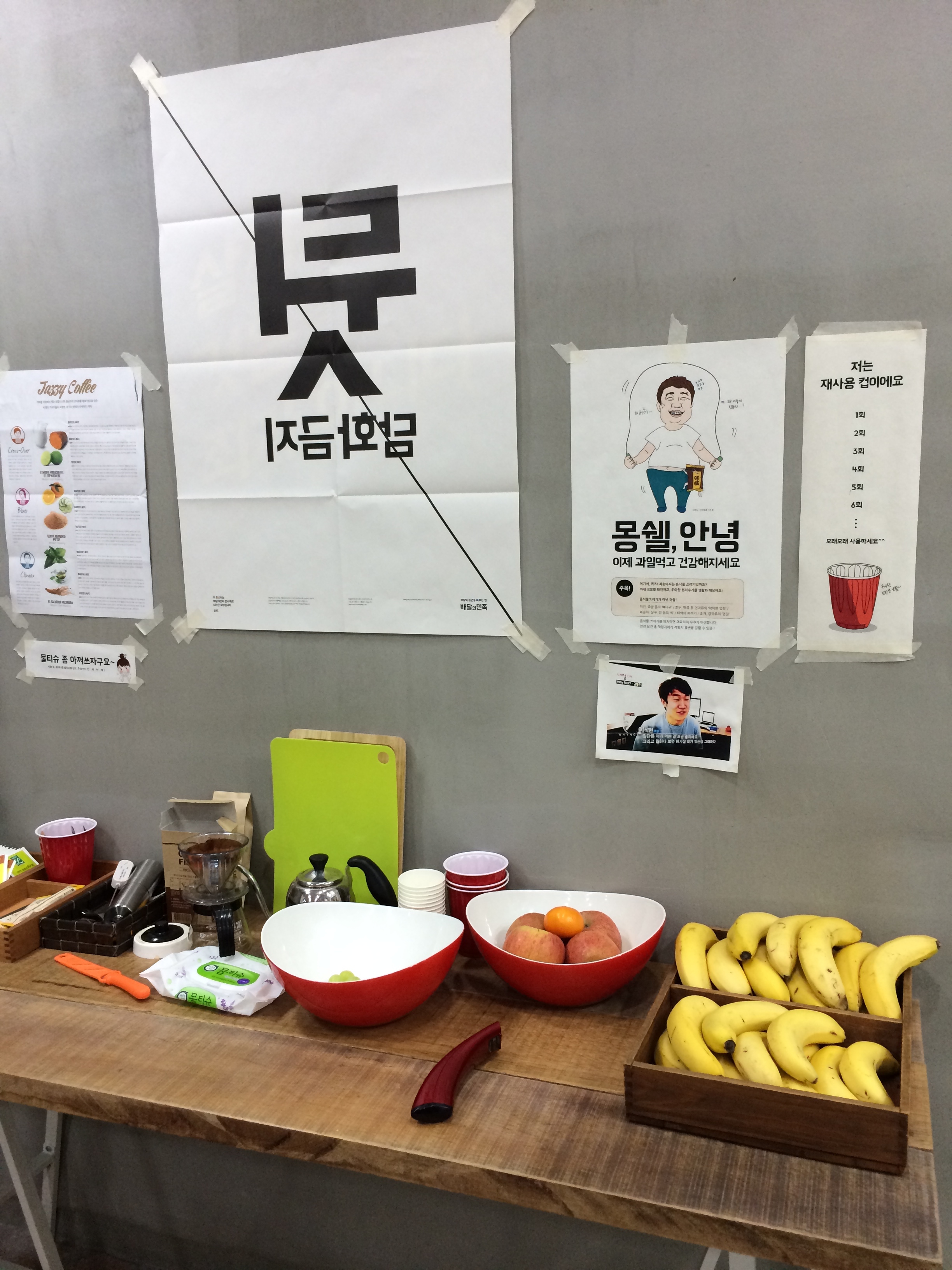 예전에는 탄산음료 등을 무제한 제공했는데 직원들의 건강을 위해서 과일을 제공하는 것으로 정책을 바꿨다. 과일은 모두 ‘총각네 야채가게’에서 공급받는다.