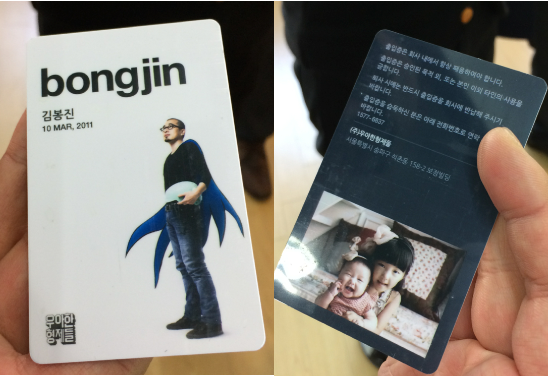 김봉진대표의 출입증이다. 가족을 소중히 하자는 마음에서 모든 직원의 출입증 뒷면에는 가족사진을 인쇄해 넣었다고 한다.