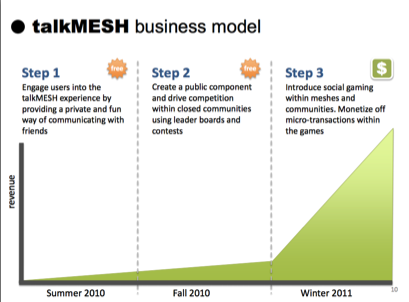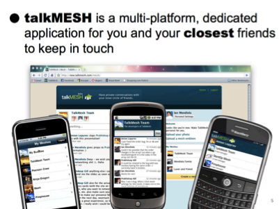 2010년 두번째 프로젝트는 TalkMESH라는 메신저앱이었다. 왓츠앱, Kik, 블랙베리메신저 등과 경쟁해서 좀더 친구들과 소셜하게 쓸수 있는 메신저 아이디어였다. 당시에 이 메신저를 발전시켜서 소셜게임을 접목시켜 돈을 번다는 플랜을 내놨으나 아무도 관심을 가져주지 않았다. (결국엔 자신의 아이디어를 한국의 카카오가 실현한 것 아니냐고 농담.)