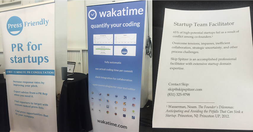 스타트업 컨퍼런스 전시장내에는 스타트업을 위한 홍보서비스나 스타트업엔지니어들이 프로그램코딩을 얼마나 효과적으로하는지 측정해주는 소프트웨어서비스, 스타트업 팀웍강화서비스를 해준다고 알리는 부스도 보이고 전단지도 여기저기 많이 뿌려져 있었다. 샌프란시스코는 길거리의 택시나 버스광고를 봐도 코카콜라같은 일반소비재 광고보다 스타트업들을 대상으로 하는 소규모 기업용 소프트웨어 광고가 더 많이 보이는 독특한 동네다.