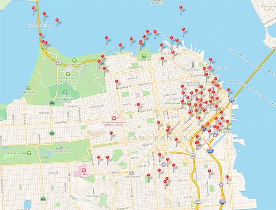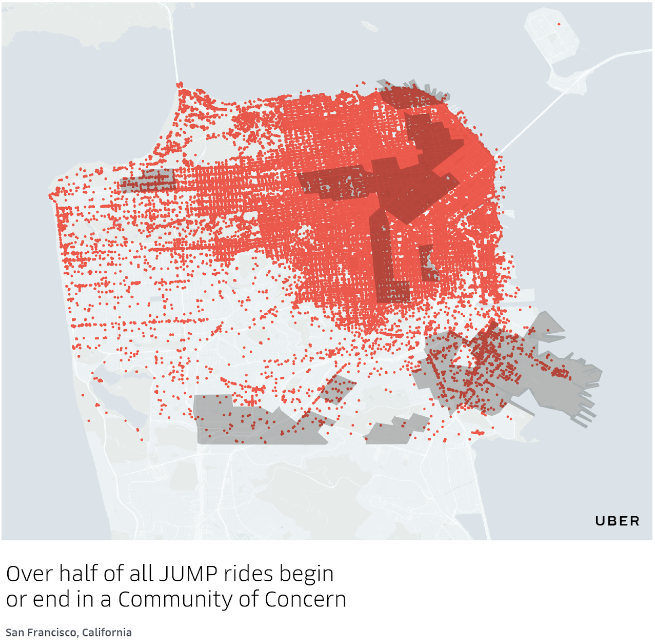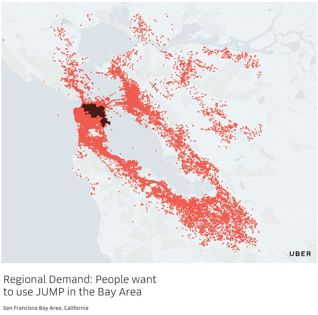 사람들이 점프 자전거 앱을 열어보는 위치를 표시한 지도다. 점프는 현재 샌프란스시코 시내에서만 되는데도 베이에어리어 전역에서 “혹시 우리 동네에서 되나”하고 점프앱을 열어본다는 것을 알 수 있다. 그만큼 디맨드가 있다는 뜻이다.