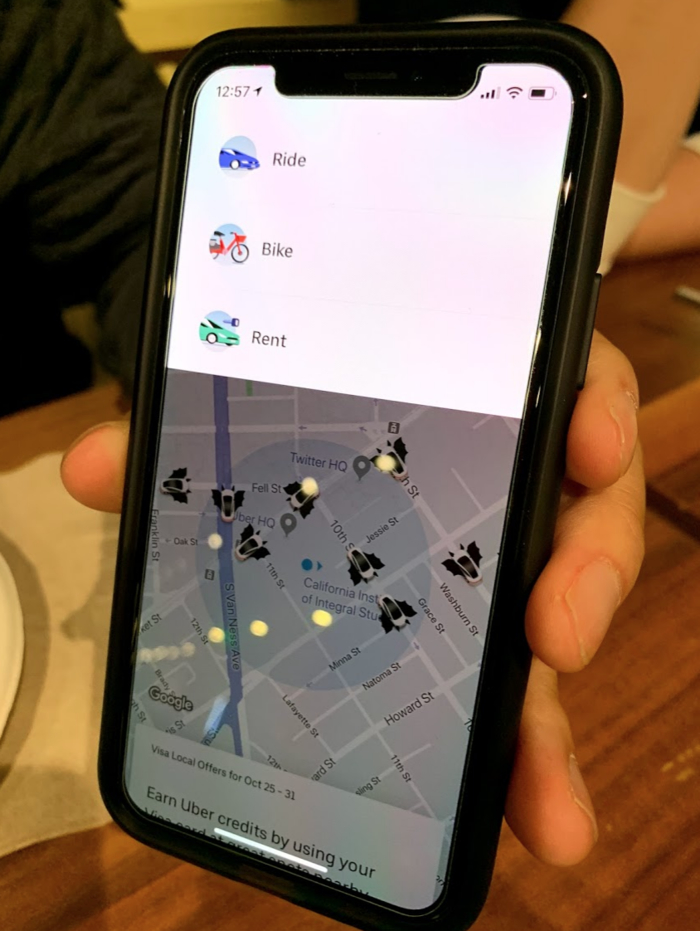 샌프란에서 우버앱을 열면 이렇게 나온다. 차를 렌트할지, 자전거를 탈지, 아니면 우버차를 부를지 물어본다. 무조건 우버가 나오는 것이 아니다. 이렇다 보니 가까운 1~2km거리에 갈 때 차보다 자전거를 타는 것이 나을 것 같다는 생각이 든다.