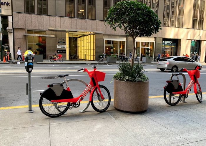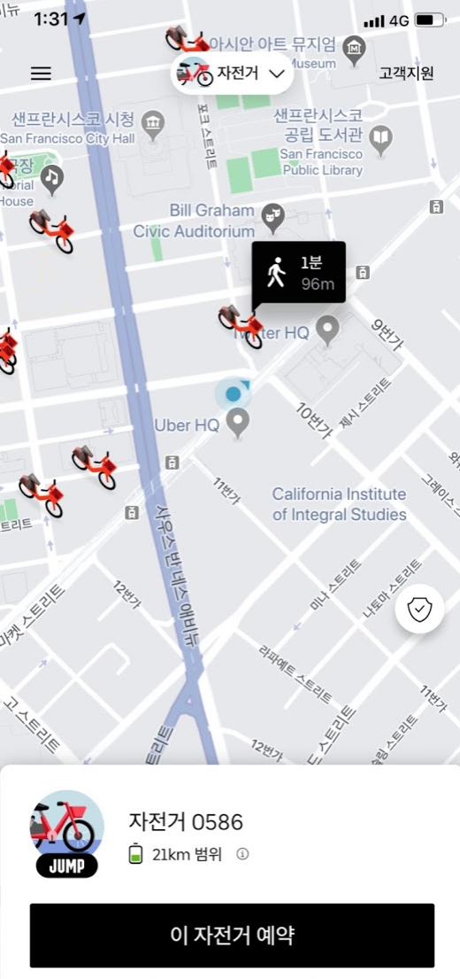 생각보다 점프자전거가 샌프란 시내에 아주 많이 보여서 놀랐다. 자전거거치대에 꽃아놓지 않아도 되는 Dockless자전거이지만 인도 곳곳에 설치되어 있는 자전거 스탠드에 끼워둘 수 있도록 되어 있다.